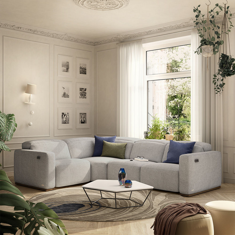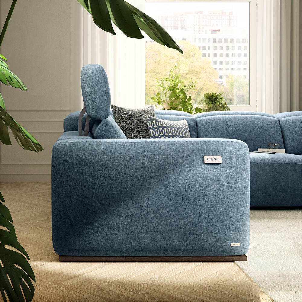 Its cozy seats hide a Dual Power motion recliner with separately adjustable headrest and footrest - operated by a push-button on the outside of the armrest, which in the armless seats is covered in leather and can be hidden between the seats. If the recliner function is activated, the headrest rises automatically to give maximum support to the head, and soon after the seat tilts and the footrest opens. In the fixed version, the headrest is manually adjustable.