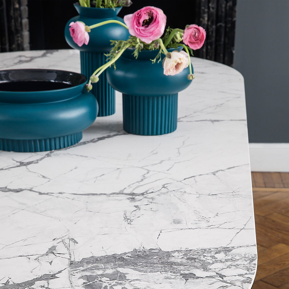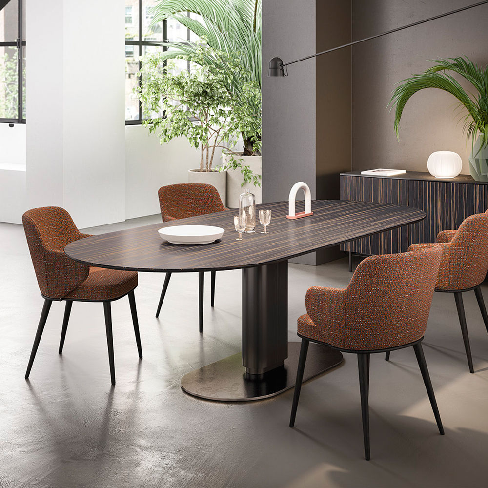 The Calligaris Cameo is an extendable table with a sharply defined oval silhouette which imbues it with a powerful personality and not only provides stability but allows the space beneath the top to be used to the utmost. Made from coated metal, the central column supports the various types of tops; a metal/wood combination is invariably refined whereas the mixture of metal and ceramic with a marble effect creates a playful contrast between cold and warm materials and is edgily modern.
