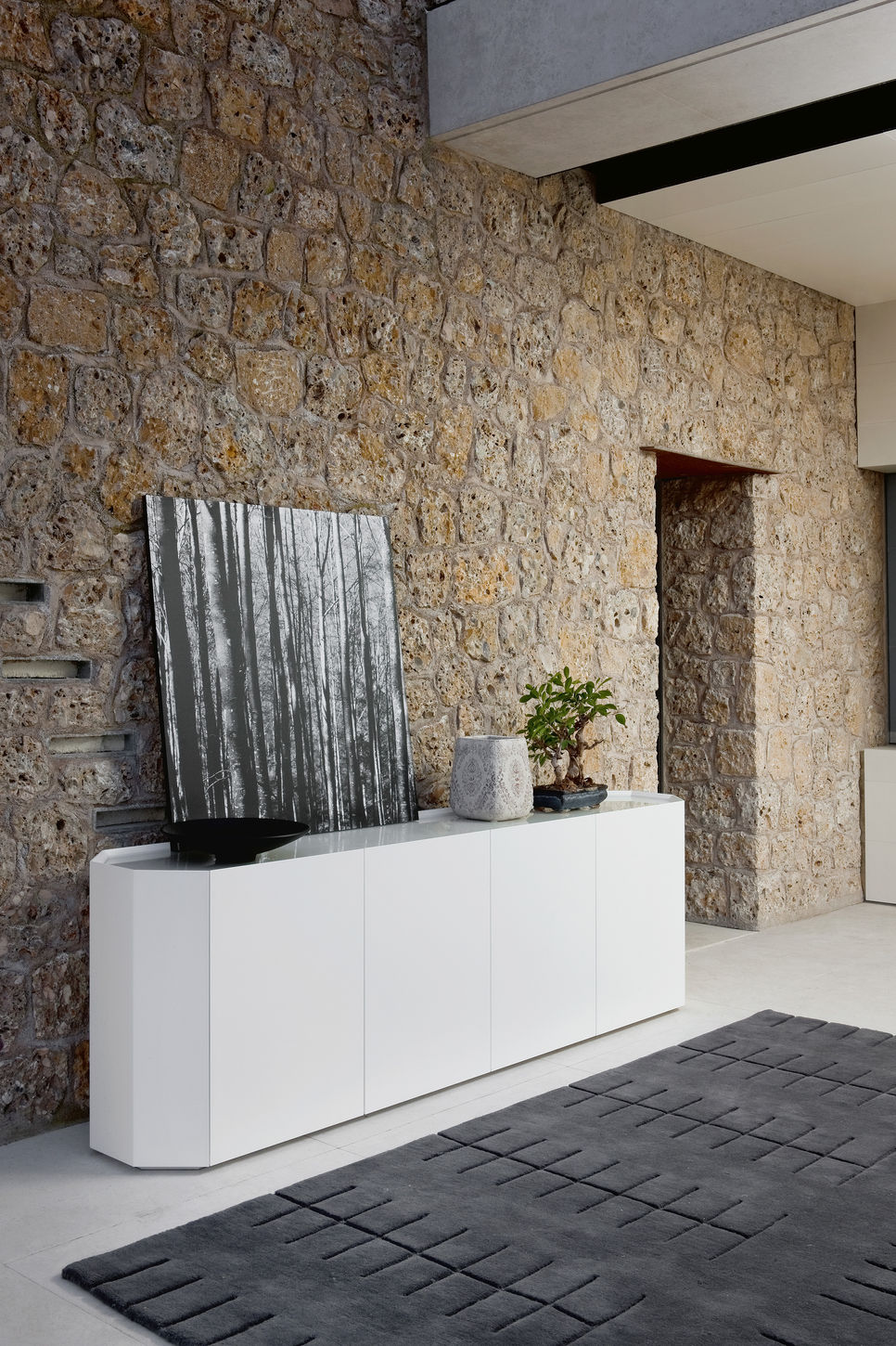 The sculptural and geometrical Chelsea modern sideboard by Cattelan Italia, designed by Alessio Bassan, integrates harmoniously into the living room style, both in residential and contract interior design projects. This minimalistic cabinet with an eclectic taste is enriched by fine details and exclusive finishes, such as the transparent glass top. Chelsea is equipped with fine shelves in transparent glass with the purpose of storing the most valuable and exquistite objects.