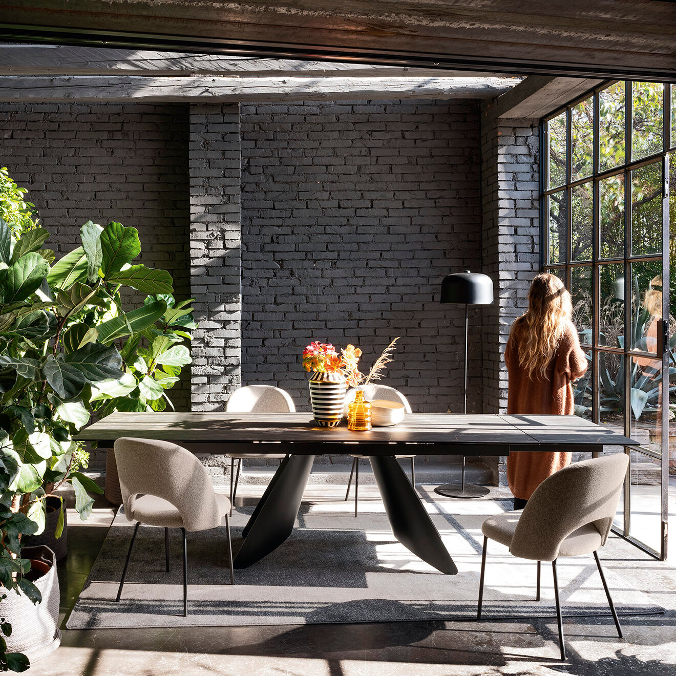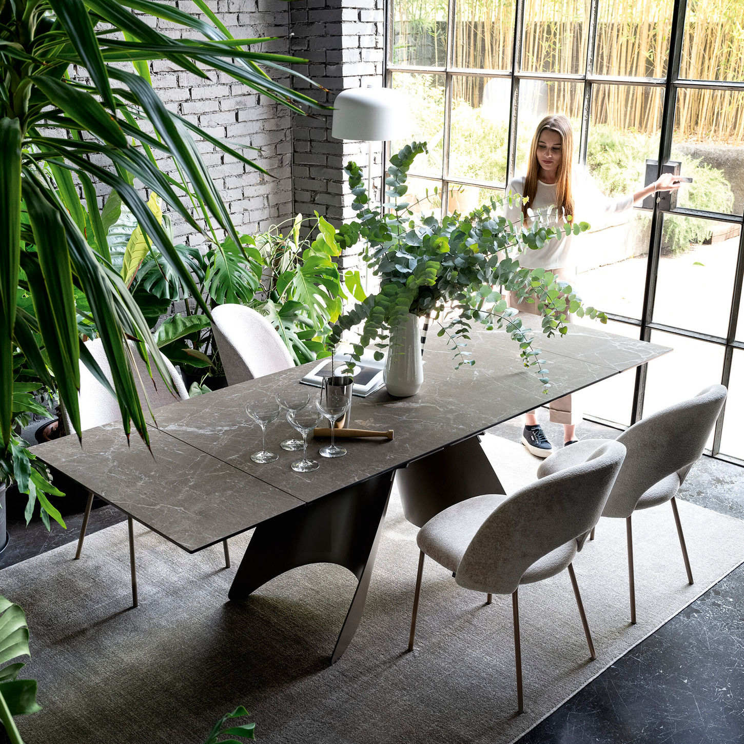 Lightweight and almost suspended, the gently curved sheet metal base of the Orion table evokes the image of a ballerina on her toes. This elegant structure is available in two variants: round and rectangular, both offered in fixed and extendable versions. Thanks to its versatility, the Orion table fits perfectly with any style requirement. In addition, the tops available in ceramic and melamine add a touch of sophistication and personalisation, allowing you to create a unique and impeccable environment.