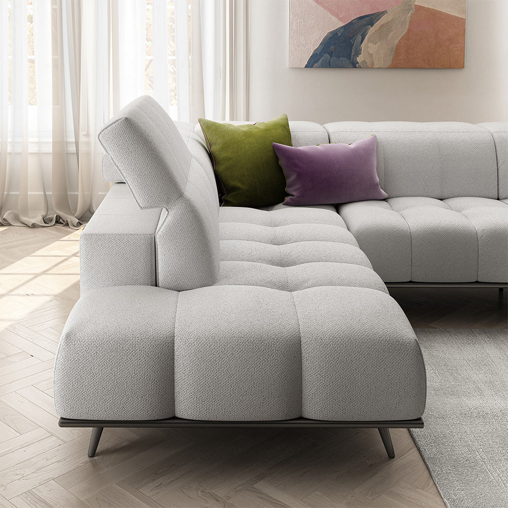 Scacco by Natuzzi Editions. When design embraces comfort. Everything about this model is toned up to emphasize its main characteristic: superior comfort. It features a large, soft seat with a quilted backrest fitted with a manually adjustable headrest. The sofa rests on a wooden base supported by elegant feet, also made of wood.