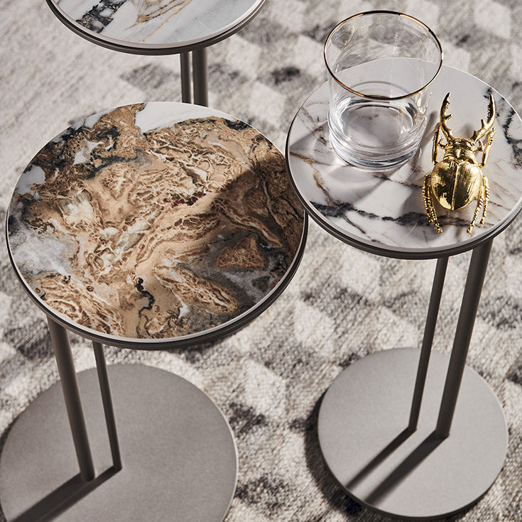 Sting modern coffee tables stand out for their natural elegance and undoubted practicality. Lightweight and easy to handle, they are incredibly useful and multifunctional living room accessories. These steel side tables can be placed near sofas and armchairs, for holding devices and magazines or for serving aperitifs to your guests in the comfort of a welcoming, flexible and modern living room. The steel base consists of two narrow legs of different diameters, enriched by exquisite metallic finishes. Initially created by Paolo Cattelan to have a Marmi ceramic top, Sting then evolved into the Sting Brushed version, with a steel top brushed freehand by skilled artisans.