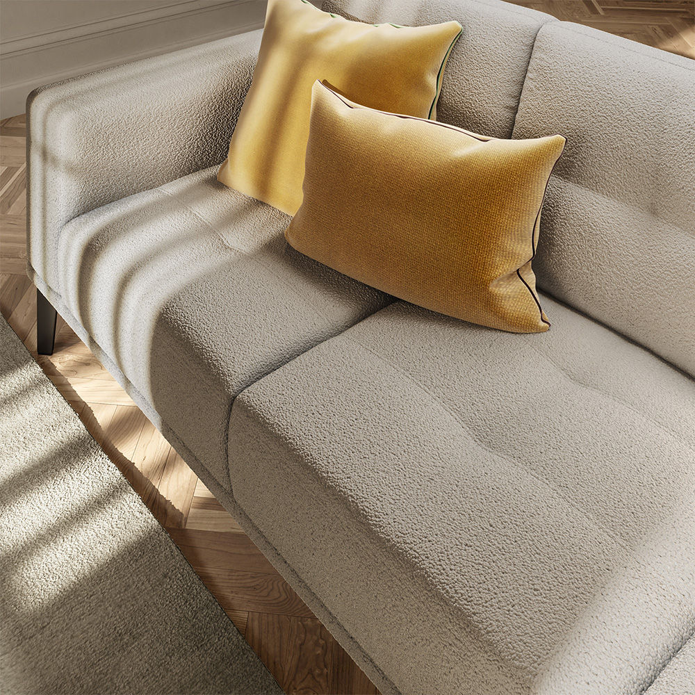 Toledo sofa represents the perfect synthesis between minimal and vintage style. It has linear, light lines - embellished with fine crafted tufting on seat, backrest end outside arm panel - and large seats that ensure excellent comfort.