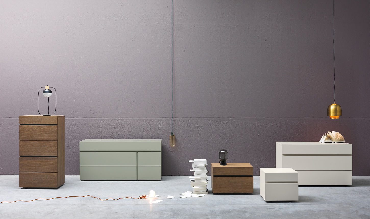 Twice is a bedroom suite with straight lines giving a sophisticated chest of drawers featuring a wide upper drawer and additional storage spaces.