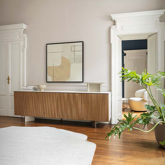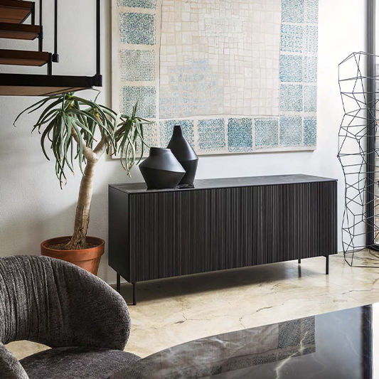 UNIVERSAL is an integrated system of modular sideboards and cabinets with an incredibly versatile design. Cabinets and entertainment units whose appearance varies according to the chosen size and finish. Compact pieces with doors that can be lacquered, wooden, plain or patterned with wave motifs, diamond shapes or squares, enhancing the innate elegance and refinement of this range. By mixing the frame, doors, base units and finishes, you will obtain an effect that suits you down to the ground.Super-slender top flush with the doors in composite stoneware and bases that come in two metal versions and a wooden one.
