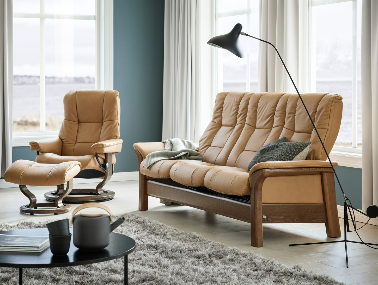 Gentle curves, padded arms and a supple seat, this sofa is as sleek as the name implies. The Stressless Windsor offers an invitation to pure relaxation in a classic design with details in wood. Individually reclining seats and available in both high and low back ensures maximum support for the entire body.